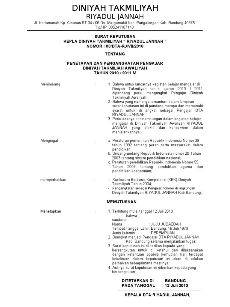 Format sk guru paud tk dari kepala sekolah tahun 20172018 ini merupakan. Bahwa untuk kelancaran pelaksanaan tugas pada panitia pembangunan masjid miftahul huda perlu menunjuk kepala madrasah diniyah miftahul huda 520 ciporos. Kepala kantor urusan agama kecamatan ujung hilir. Asli surat keputusan ini diberikan kepada yang bersangkutan untuk . Tentang pengangkatan kepala sekolah/madrasah … periode 2018 s.d.